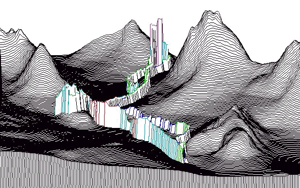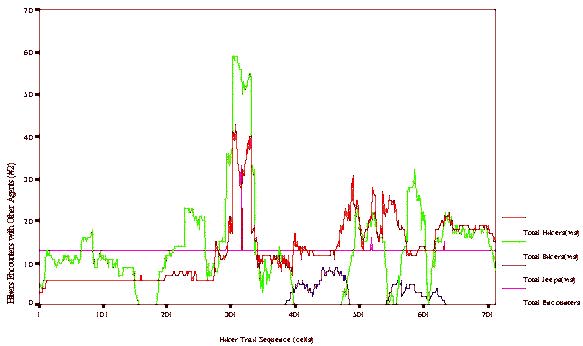 The summary statistics for each cell are recorded for each agent in the simulation. Agent type, age, personality, column, row, energy, energy expended, velocity, physical encounters with other agents, visual counters with other agents, time viewing landscape, time resting is stored for each agent are all stored. This information is subsequently used to determine spatially represented physical and visual encounters and movement patterns along the trails. This information is used to graph the number of encounters overtime for each of the agents being studied as illustrated in figure 1 and as a three-dimensional image figure2. Maps of conflict areas or concentrations of encounters along the trails can be directly obtained from this software and translated in to any GIS format.